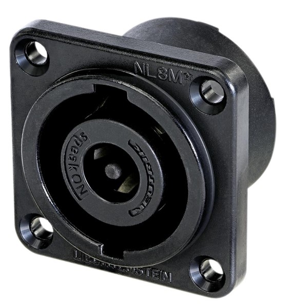 The NL8FC is 8 pole cable connector, latch lock, chuck type strain relief for cables 8 - 20 mm diameter, 30 A continuous per contact The NL8FC has rated current per contact of 30 A rms continuous. The industry-standard for loudspeaker connections offer extremely reliable and robust cable connectors with a reliable locking system. They feature solid contacts with screw-type terminals including a stranded wire protection which offer also solder termination.