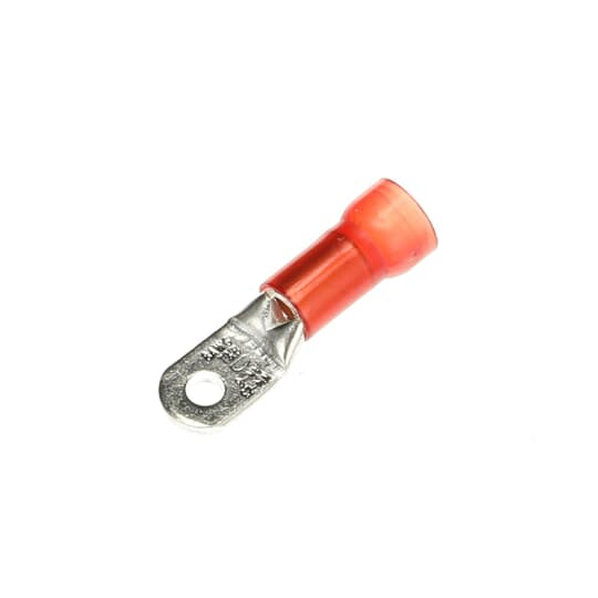 The RE6-10 is a large ring terminal insulated with high dielectric-strength nylon for wire size #6 AWG. These ring terminals have funneled barrel entry, deep internal serrations, and brazed or overlapping seams. Length 1.65 inches, .49 inches width, maximum insulation .420 inches, bolt hole #10. The terminal is high-conductivity electrolytic copper, electro-tin plated, with color-coded insulation, rated for 105°C max temperature. Installing tool ERG4007.